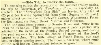 Piney Ridge Amusement park was built by the Hartford and Springfield Railway. Piney Ridge was built in the early 1910's and later closed in the early 1920s. It was a small park but they did have a baseball field, a roller skating rink, a carousel, a dance hall, concession areas and other recreational activities.