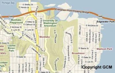 Evidently the beach "area had a favorite picnic/camp ground for the pioneer families, for the Judge built wooden platforms on which they could pitch a tent and stay all summer - if they brought enough supplies in a wagon. "Tent City" it was called and was just south of what is now Blaine Street. The system of bicycle paths developed in 1898 by Cotterill included the park in its 25-mile system. Since the water along the was 9' before the 1917 ship canal opening, McGilvra developed the waterfront with a boathouse, piers, and twin offshore with shoreline seating for a "thousand" persons who could enjoy beer to the tunes of Wagner's Band or full-blown operettas of Gilbert and Sullivan, villain for the delight of the audience, Cruises around Lake Washington were available on steamers of the famed "Mosquito Fleet" (which also operated on Puget Sound. The Seattle Golf and Country Clubhouse was developed in the (Laurelhurst) area and the directories from 1901 to 1907 directed its patrons to go "by boat from Madison Park" to Webster Point, for bridges and roads were few and in poor condition - SO Why not enjoy a ride on one of the "new-fangled" cable cars and a motor launch on Lake Washington ?
