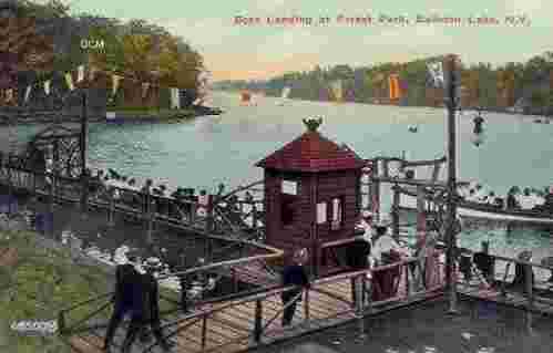 ----- photo of boat landing, part of Forest Park, an amusement park built by the Schenectady Railway trolley company on shore of Ballston Lake. Also shows walkway along shore.