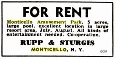 1922 when the moviegoers visited the Rialto Theater, the new showplace in town. The Monticello Amusement Park was popular until it burned in 1932. Monticello played host to the Sullivan County Fair for over fifty years until it closed in 1931. Although few of Monticello hotels successfully made the transition into the later resort age, the village continued to draw the tourists who stayed at nearby hotels and bungalow colonies......