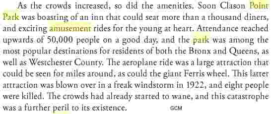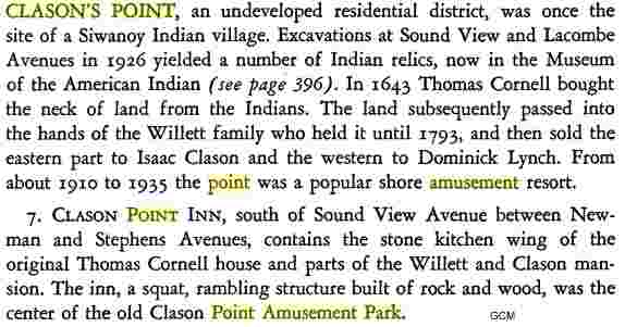 By the early 20th century Clason Point was a mix of estates, farmland, and plenty of undeveloped swampland. Several landowners commercially developed their properties as picnic areas, beaches, dance halls, and amusement parks. Ferries between Clason Point and College Point in Queens ensured a steady stream of visitors, and the destination point for daylong excursions soon grew into a seasonal resort.