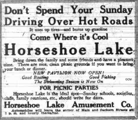 Hodges owned Horse Shoe Lake for 20 years, hiring different young men to run it for him. In 1911 Anthony Fix became the manager and Hodges offered to sell the resort to Anthony Fix's brother, Frank Fix. Frank and Anthony Fix were printers who had many other interests through the years besides Horseshoe Lake. They were the Fixes of the Fix Printing Company. In 1912 Frank Fix organized the Horseshoe Lake Amusement Corporation financed by a number of other local men. Anthony Fix and James McCormick (we believe a brother-in-law of George Watson of the Hotel Richmond). George W. Pratt and Christopher Casey (the father of the present Christopher Casey) were members of the board. James L. Kelly, a local attorney, was secretary. The new owners made many improvements, rebuilding the bathhouses, adding more boats and installing a steam launch in the Lake. They then put up billboards along roads leading to Buffalo and Rochester that read GENESES COUNTY-CONEY ISLAND-HORSESHOE LAKE. People began to come from distances away. The corporation built a toboggan slide, which was just a long chute that ran out over deep water down which the venturesome slid sitting on a board. There was a merry-go-around there for one summer. One Monday issue of the Daily News reported that there bad been a style show at the Lake the Saturday before. Louis Wiard had been in New York City and had brought back the latest in bathing costumes, which his wife and her friend Mrs. Kinne wore at the Lake the next weekend. Of course the latest in bathing costumes in 1914 bad skirts down to here and stockings up to here and a dust cap for a swim cap, but Horseshoe Lake was able to see what was being worn at the smartest beaches. Virginia Trietley wrote articles about early days in Genesee County for the Daily News for a number of years and in 1956 wrote one in which she called this period 'the golden age of entertainment at the Lake.'