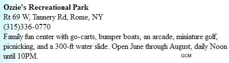 Nothing known except Norton Auction of Michigan auctioned an Amusement Park named Ozzie's of Rome, New York. Year? Last couple of decades? There still exists an Ozzie's Recreation Park in Rome, New York. -- no CLOSED about 2007 ??