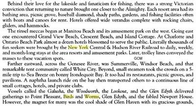 I list these places because they are on lists of old Resorts in the Rochester area and had 'Trolleys and Ferries' going to them. The problem just might be there is no history surviving. Windsor Beach, Summerville, White City....(White City not related to others to my knowledge)