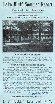 It is well adapted for outings, being reached by carriage or auto from the mainland, the Northern Central Station, and the Rochester and Sodus Bay Trolley R.R.