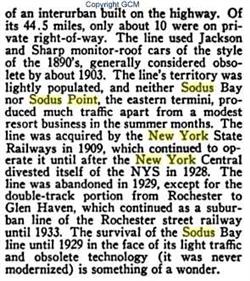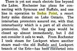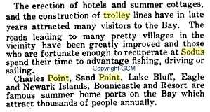 Sodus, six miles from the Point by trolley, is a banner village of the United States for the production and marketing of evaporated apples. It also boasts the unique distinction, of having the finest Opera House of any village of its size in the country. The Rochester and Sodus Bay trolley follows along part of that pioneer highway - "The Ridge Road, once the pebbly beach of the pre-historic lake extending to Lewiston. And in the leafy month of June, when all the world's astir, the "Apple Blossom Ride" from Rochester to Sodus Bay is a fragrant memory.