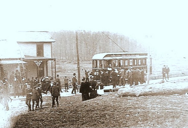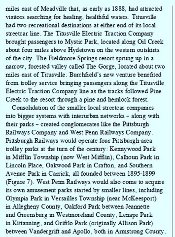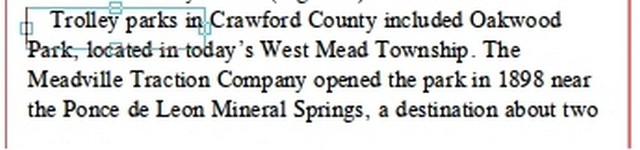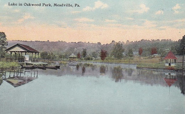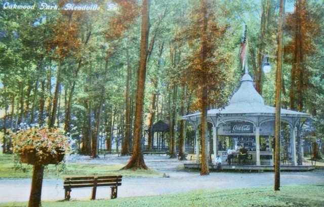 Today, a historic brick monument built by the sons of John J. Shyrock in 1950 marks the spot. Water from the spring is still accessible at times, for those who wish to give it a taste. The demise of Oakwood Park, however, began with the extension of trolley lines west from Meadville to Exposition Park (later, Conneaut Lake Park) in 1907. The relatively subdued nature of Oakwood made it hard to compete with the excitement of thrill rides and larger array of activities offered at Exposition Park. Attendance slowly declined in the years that followed. When the traction company began to lose money, trolleys stopped running to Oakwood, and the park quickly faded. In 1918 plans were announced to dismantle most of the structures and remove the trolley tracks. By 1920 all of the structures with the exception of the Dance Pavilion had been torn down and the dam was destroyed.