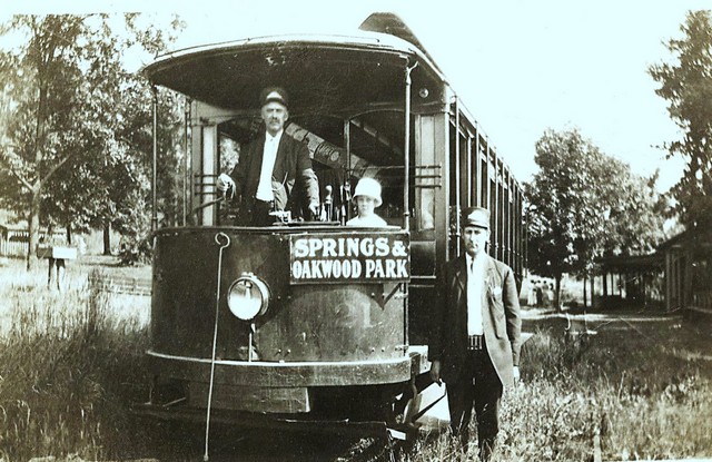 Boaters in the foreground watch the trolleys coming and going with more patrons The trolley lines ran along the dam and ended at the Ponce de Leon Mineral Springs. Research suggests these "sparkling waters" were held in high regard by the Indians and early settlers of the area. Henry Johnson took to bottling the waters and around 1887 was touted as "showing commendable business enterprise" in marketing and distributing the water. Many testified to its medicinal properties. It was available plain or carbonated and was used in the making of an "extra fine quality" ginger ale. Given the popularity of Oakwood Park combined with the draw of Ponce de Leon Mineral Springs plans were made in 1898 to build a large hotel; however, the idea went no further than this.