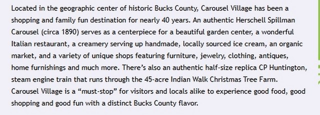 Country shops, amusements, garden center, birthday parties, school tours, corporate and family outings. We have an antique Hershell Spillman 1890 Carousel and a 3/4 replica of a C.P. Huntington Train that you can ride. Visit our exotic animals from around the world. The country shops feature antiques, craftwork, food, carousel items, gifts and household decorations. Also visit Carousel gardens, a quality nursery that blooms all year. We have something for all ages. Three miles north of Newtown, in the heart of Bucks County.