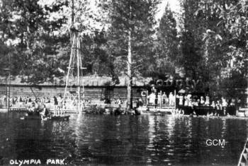 Beginning in the late 1890s, there was also Lake Olympia, which was clearly an amazing community treasure! This man-made, approximately twelve-acre lake was the place to sun and swim and boat and dive for several decades. Despite being public and not overly deep, this was no dip in the Ganges- old-timers say its inflow of spring water kept the lake clean, clear and cool even during the hottest days of summer. And that comes in handy when your wearing a rented, wool, full-body suit that weighs twenty pounds when wet! There are postcards from the 1920s through the 1940s showing plenty of happy swimmers at Lake Olympia and locals recall taking swimming lessons from Frank Johnson, the one-armed lifeguard. There was a four-tiered high-dive tower and rings to swing out over the water for feats of daring-do, along with canoes and row boats offering quiet pleasure for the more reserved. The lake had campgrounds and cabins, a bath house, a beach, a restaurant, a soda fountain and a bar. Speaking of the bar, which did offer hard liquor, I was unable to find a description of how Prohibition was handled at the lake but there is a mention of a secret slot machine that you could play if you knew the right people.