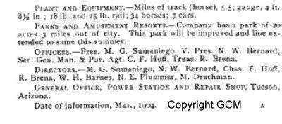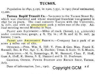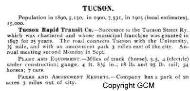 From 1898 to 1900 Tucson Street Railway ran a line from the Southern Pacific depot to the University of Arizona campus via Congress, Stone and 3rd Streets with a branch line west on Pennington. Service was expanded around 1900 via South 4th Avenue and 17th Street to Carrillo Gardens, location of today's Carrillo School. This site, renamed Elysian Grove 1902 was a 25 acre park noted for its floral displays, amusement park and man made lake.