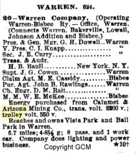 In 1908, "Warren-Bisbee Railway" trolley line began. According the to the Warren Company's 1908 Annual Report, the electric system was completed from Warren to Bisbee and to the mines, and an extension of the road was built to the Warren District Country Club, a distance of about three-quarters of a mile south of Warren. This electric line was thrown open to the public on March 11th, and the arrival of the first car into Bisbee was the occasion of one of the greatest demonstrations ever held in the camp. From the opening of the line to the end of the year, over one million passengers were carried, and the business of the line has shown a very steady increase each month.