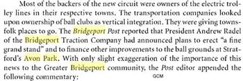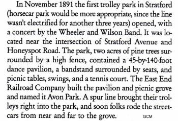 Avon Park, Stratford, Connecticut. A Trolley Park. This Park is very elusive in any records. It would appear it was designed for a Baseball Park and I do not list so-called Baseball Parks. BUT until more is known ? The Trolley did not just go to the Park but the Park was it's creation and for Trolley Parks kinda strange if just for baseball. (??)