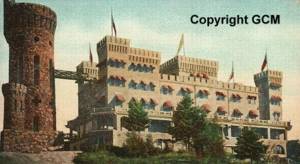 The Castle was built on a high rocky hill overlooking the bay which gave it its name. The approach from the trolley line was by means of a suspension bridge across a branch of Spar Creek. A flight of steep steps led to the hotel which was built entirely of wood with gray shingles to simulate stone. Many described the Castle as a Yankee's dream of a Spanish castle. It was joined by bridges to the stone tower which still stands today.