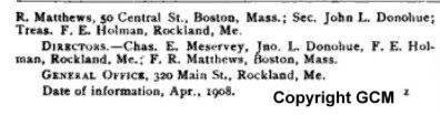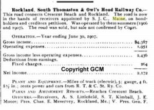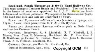 On Sept. 3, 1914, a car left the tracks after crossing a trestle in Maloney's field, near Head-of- the Bay and overturned. One woman was killed instantly and several other persons injured. Ambitious plans to continue the line to Tenant's Harbor and thence to Port Clyde, never got off the ground, due to continued financial difficulties. The fatal accident also had much to do with the trolley line's going out of business for good in 1917-18, in terms of claims and increased operating costs.