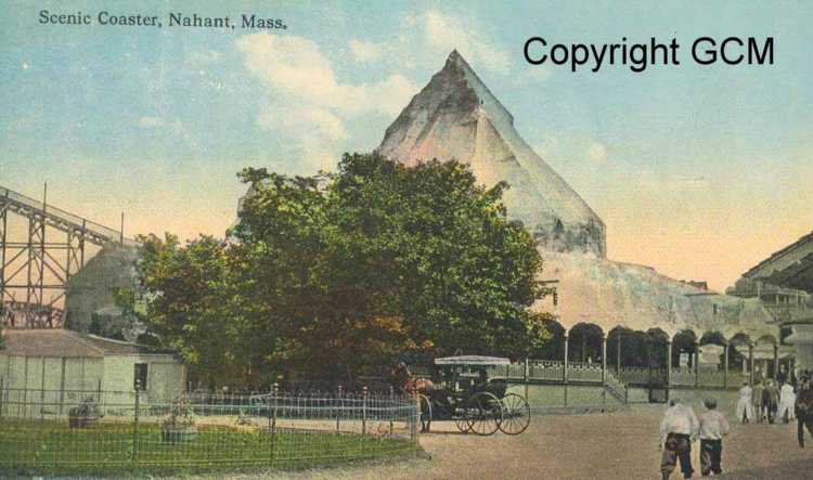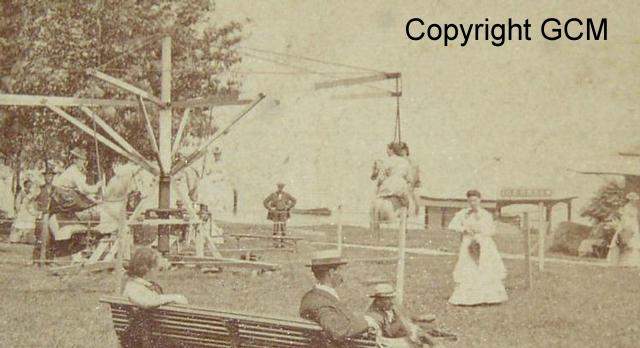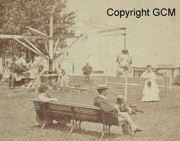 Around his pasture Nahants master of the unexpected erected a ten foot slat fence with entrance gate (adults,children). Inside,he planted trees and flower beds, built a restaurant on the edge of the cliff overlooking the ocean, a dance hall, a small hotel, several open pavilions, which could be hired for picnics that required cooking, and an ice cream parlor. His men installed sea-saws and swings, one of which was 50 feet high with a collective seat. Flying Horses were added, and a shooting range, a croquet field, bowling alley's, Wheels of Fortune, a 'Punch and Judy show, caged animals and two tame bears. Indians from Old Town, Maine sold blankets and trinkets, and concessions were let to the baloon man, the candy man and the tintype artist.