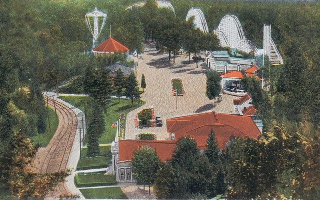 Restaurant and Dance Pavilion; a view of Midway with the Mountain Wildcat Roller Coaster visible in the background The Summit House burned down on October 8, 1900 and an even larger one was built, seven stories high to the top of its golden dome. It had a restaurant for fine dining. The popularity of the Summit House and the park continued to grow. In 1911, a new ballroom, restaurant and dance hall were constructed in the Greek revival style. The former dance hall was converted into an arcade. The carousel building was given a facelift to blend in with the new restaurant. In 1915 the switchback railway was replaced by the 'Gorge Scenic Water Ride.' Later on, a ride called the 'Tango Dip' was added.