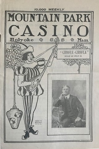 A playbill for a performance of French libretto Giroflé-Girofla at the Mountain Park Casino, July 21, 1902 In 1888, William Loomis, one of the Company's directors, took ownership of the Holyoke Street Railway Company. In the following years, he purchased 365 acres (1.5 km2) of 'cow pastures with scenery' on the side of Mount Tom. In 1894, Loomis constructed an open-air stage there, which attracted many patrons. The next year the trolley line was extended up to that point. In 1897, Loomis applied for and was granted a charter with the state for building a 'pleasure resort.' A dance hall, open air restaurant, switchback railway and merry-go-round were constructed. A unique cable railway was created to take visitors to a new building at the summit of the mountain. It was from this building President William McKinley stated that the view from Mount Tom was the most beautiful in the world. A new enclosed theater was built, The Casino, with seating for 2,500 people. It mainly presented light opera. Loomis continued expanding the resort with his assistant, Louis Pellissier. One of the biggest attractions for the city folk was the collection of picnic groves and beautiful gardens. There were reflecting pools, arbors and even a small zoo featuring bear and deer cages.