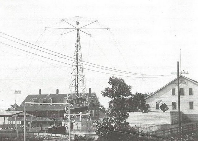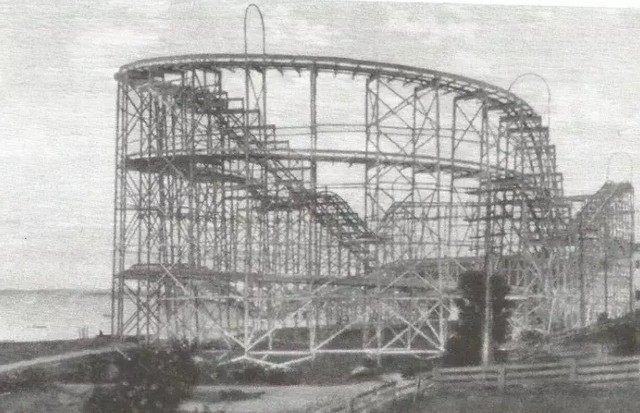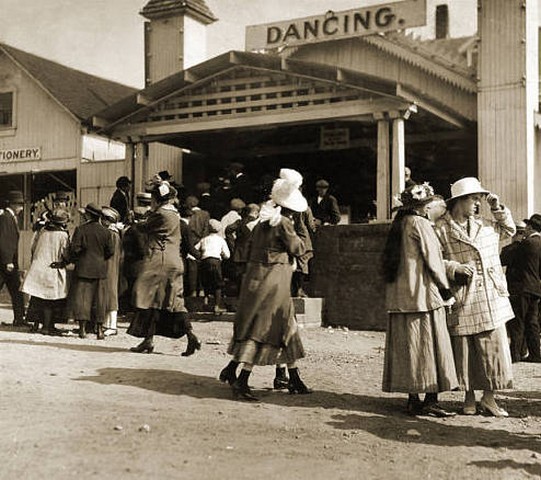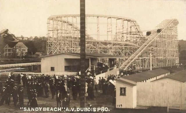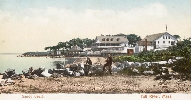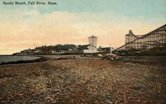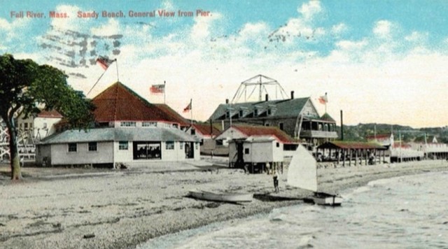 View from Pier, Sandy Beach, Fall River, Massachusetts. Sandy Beach Amusement Park was located on Mt. Hope Bay on Bay Street, Fall River at the Fall River-Tiverton, RI state line. Prominent in this view are the carousel, pavilion, dance hall, bath houses and the top of a swing ride. (see images below)