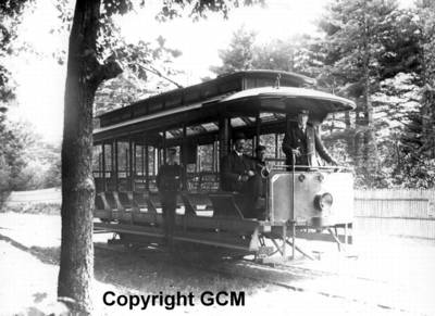 An open summer electric car on most weekends would be full with both young and old. Most came to enjoy a day at the beach, boating or picnicking and some would spend most of their time in the dance hall where one bought tickets for a dime that would allow them one dance per ticket. Wrentham's motorman , Rodney Tyler, stands in front of his car.