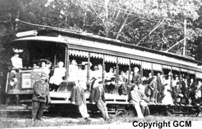 The Milford, Attleboro & Woonsocket Street Railway Company ran a spur branch from their line at the bottom of Eagle Hill directly into the Park grounds as shown here as a near empty car arrives to transport customers from a day of relaxation and recreation.