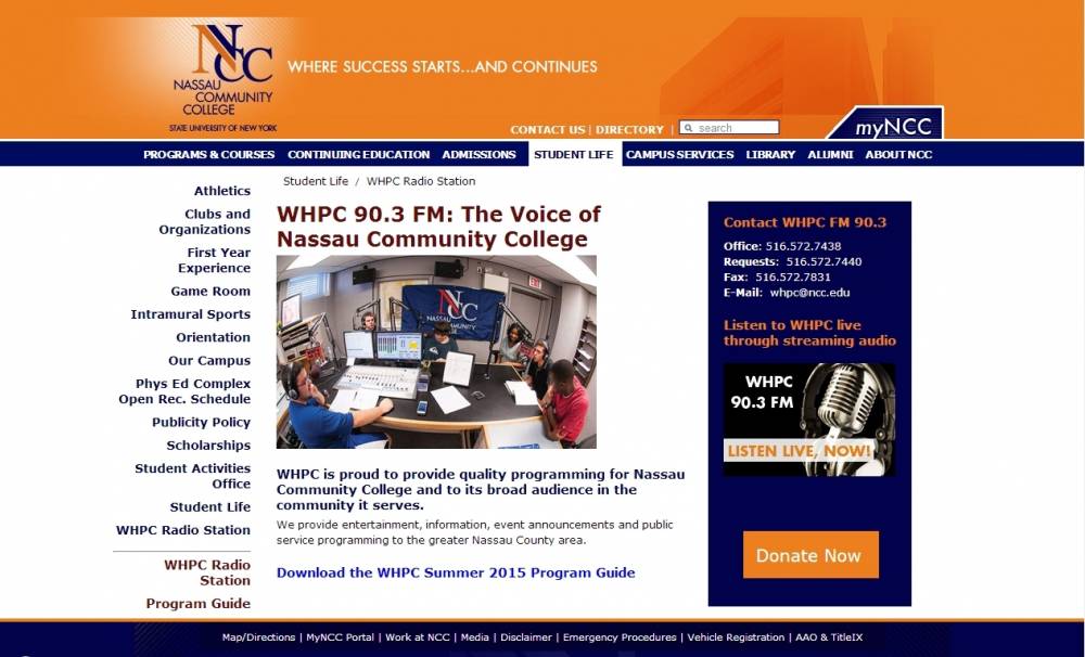 WHPC is the radio station of Nassau Community College in Garden City, New York. WHPC began broadcasting on October 27, 1972. The first song played was "Listen to the Music" by the Doobie Brothers. The station broadcasts on 90.3 MHz, HD1, and streams online at www.ncc.edu/whpc and http://tunein.com/search/?query=whpc. Some of its popular shows are Motormouth Radio with Chris Switzer and Ray Guarino, The Super 70's with Ron Stevens, Everything and Anything with Steve Mangiaracina, Sinatra Serenade with Glenn DeMilt, Conversations with Ray Bertalino, "Beatlesongs" with Rob Leonard, Good Gold with Ed Newlands, The Essential 80's with Jaime Trovato, The Unforgettables with Michael Anthony, Thunder Road Radio with Kim Tracy, The Party Mix with Stephanie Lombardo, The Rare Groove Sessions with DJ Solero, The Sock Hop with Steve Dassa, Piano Man with Chris Muldoon, 90's NOW with Angelo Gisonda, Beyond the Game with Matt D'aguanno, Conor Hickey, and Sean Cerise. and Extreme Rock with Arash Zandieh,