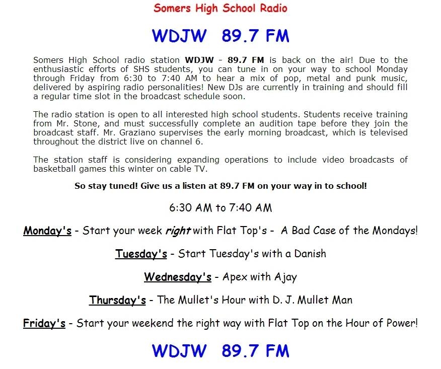 The earliest Federal Communications Commission (FCC) document available on line is an “original construction permit” which was granted on June 25, 1979 authorizing construction of a station on 89.7 MHz with 10 watts of power. A License to Cover was granted on March 14, 1980. A “Major Modification” was granted by the FCC on February 28, 1983 but the on line data base does not specify any details. On December 12, 1990 a Construction Permit was granted to change the frequency to 105.3 MHz. Reportedly the Board of Education decided not to pursue this change and the next FCC database entry is a renewal on June 10, 1999 showing the frequency as 89.7 MHz.