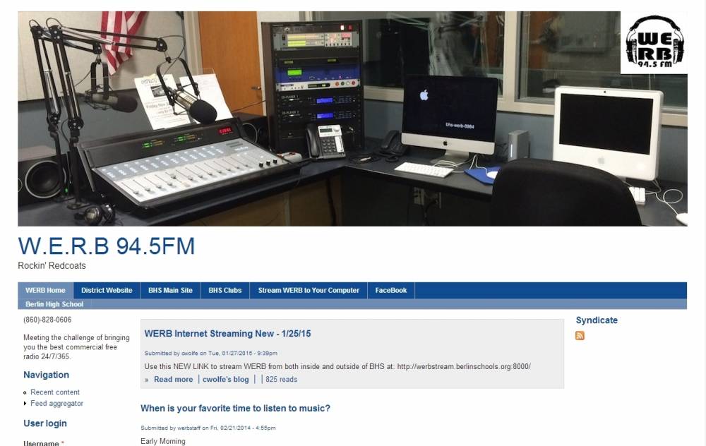 WERB is mainly run by the Berlin High School Radio Club and its faculty advisor Chris Wolfe. Students are trained to be DJs, radio hosts and announcers by upperclassmen experienced in broadcasting. The high school radio station broadcasts local news and sports in addition to music. The radio station's radio format varies from hour to hour. All music played on the station is free of profanity, overt sexual overtones, and violence. Early mornings consist of easy-listening jazz, 10:00am to 2:00pm consists of country, and afternoons from 2:00 to 5:00 is rock. An automated program keeps content on the air during times when students are not available. On air requests can be made by calling (860) 828-6577, extension 316, or (860) 828-0606.