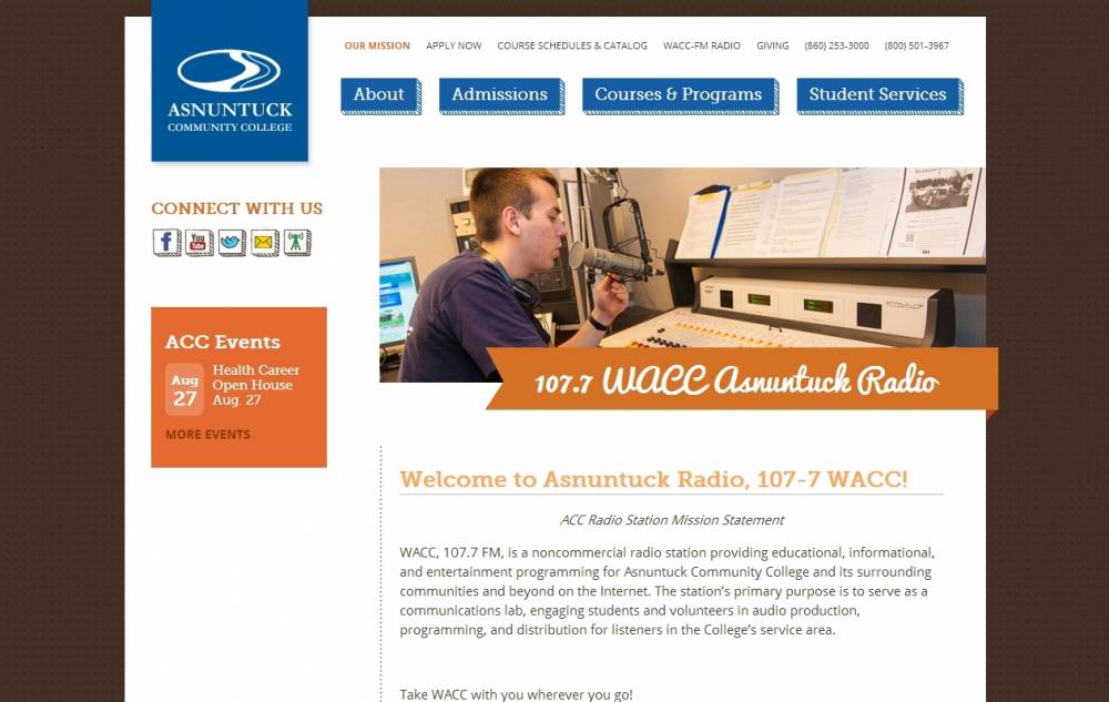 WACC-LP (107.7 FM) is a radio station broadcasting a Rock music format. Licensed to Enfield, Connecticut, USA. WACC was one of the first LPFM stations in the state of Connecticut and operates 24 hours a day with a 100 watt ERP signal. The transmitter is located at the Enfield Fire Department. Despite its low power the signal can be heard as far north as Northampton, MA and as far south as Farmington, CT. The station is currently owned by Asnuntuck Community College.