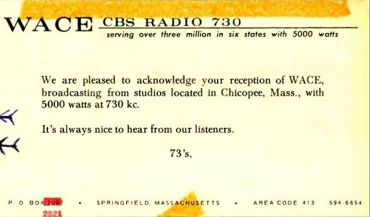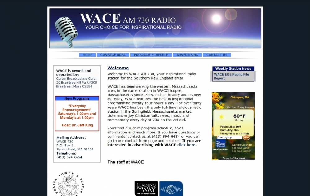 WACE (730 AM) is a radio station broadcasting a mixed Christian radio and infomercial format. During the 70s, the station broadcast a very popular Oldies format. Licensed to Chicopee, Massachusetts, USA, the station serves the Springfield MA area. The station is currently owned by Carter Broadcasting.