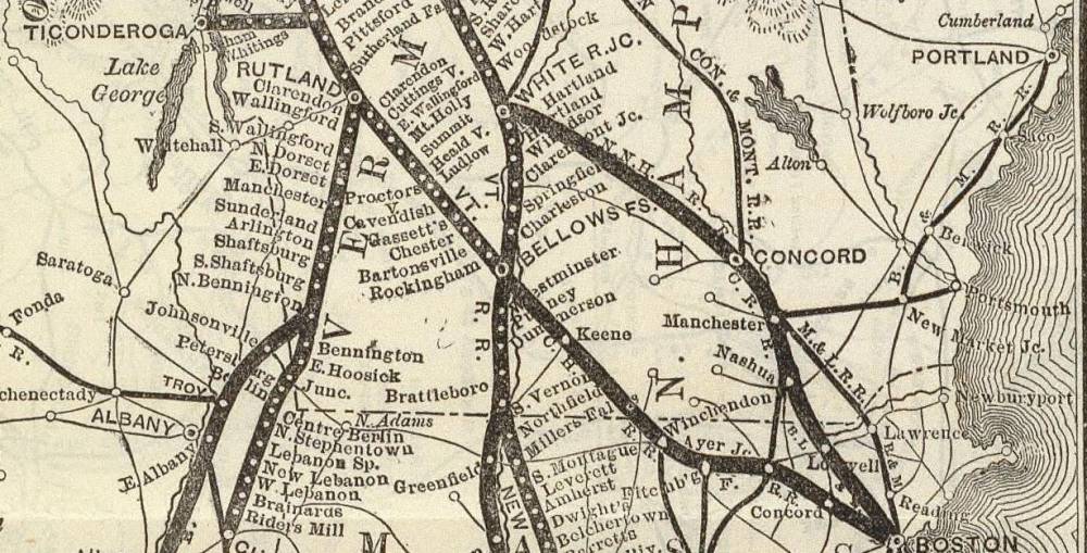 The Sullivan County Railroad continued south from Windsor to Bellows Falls, where it met the Cheshire Railroad towards Boston. At first it was operated by the Central Vermont, but later the Boston and Maine Railroad gained control of it, giving trackage rights to the Central Vermont. Similarly, the Vermont Valley Railroad, running south from Bellows Falls to the New London Northern Railroad in Brattleboro, was originally owned by the Rutland Railroad and later by the B&M.