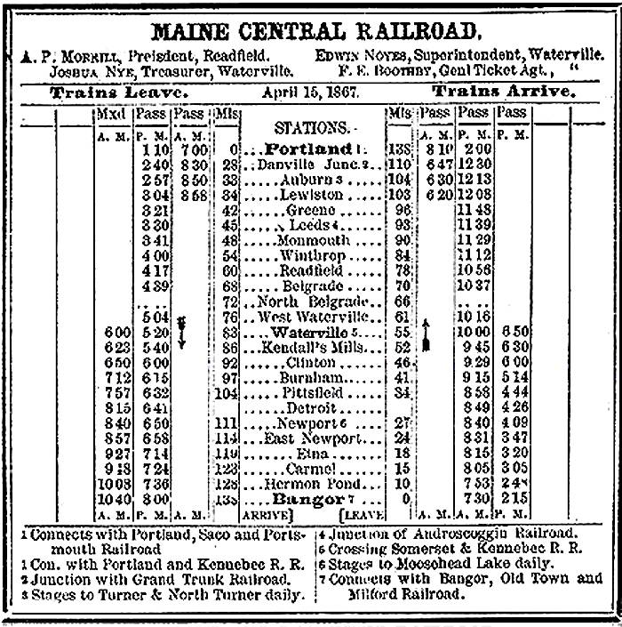 1862 Merger of the Androscoggin & Kennebec and Penobscot & Kennebec created a Portland gauge Maine Central Railroad mainline from Danville Junction to Bangor.