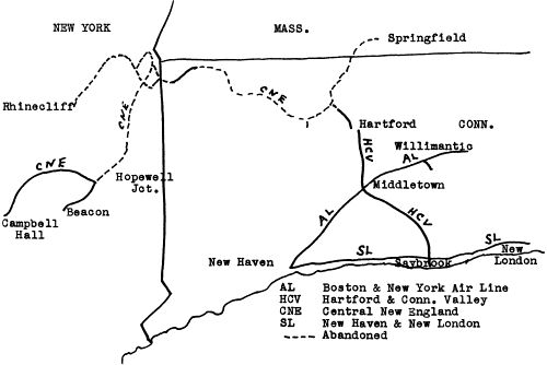 A timetable of the Central New England and Western RR Co., of June 30,1890, shows 8 trains on week days out of Hartford. It also shows a Day Express Train with Pullman buffet parlor cars Boston to Harrisburg, Pa., without change, via the Poughkeepsie Bridge Route. This train left Boston at 8:00 a.m., arriving in Harrisburg at 12:10 that night. It also shows a train leaving Boston at 5:45 p.m. for Philadelphia, Baltimore and Washington, with Pullman buffet and sleeping cars, arriving at Washington at 11:20 a.m. next day. These trains ran from Boston to Northampton via the Boston and Maine (former Central Massachusetts RR) and from there to Simsbury via the N Y, N H & H, then to Campbell Hall and the connecting road, via the C N E & W.