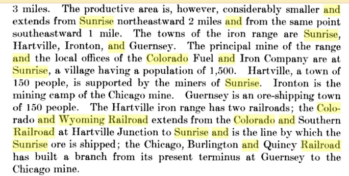 In the 1880s the area around what would become Sunrise was an important area in the mining of copper. In 1890, Charles A. Guernsey, after whom the nearby town of Guernsey, Wyoming is named, founded the Wyoming Railway and Iron Company to exploit iron mining in the area. In 1898, the Colorado Fuel and Iron company began leasing mining rights in the area to improve its supply of iron. In 1904 Colorado Fuel and Iron bought the entire Sunrise Mine.